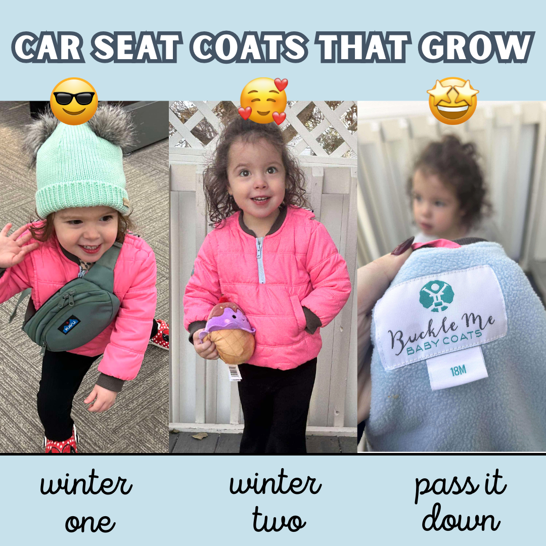 Buckle Me Baby Coats are crash-tested, CPST-approved and designed with split shoulder seams called Secure Me Strips and a pre-compressed thin back so the harness sits snug against your child's body without wrestling coats off every car ride.